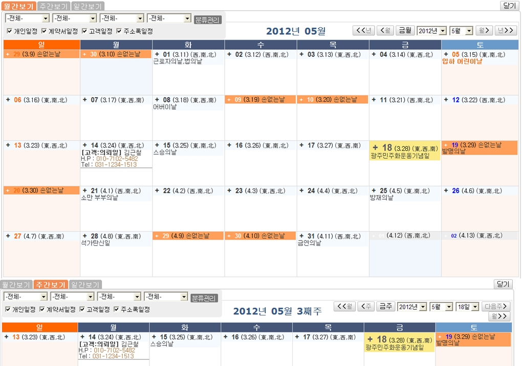 개인일정, 계약서 일정, 고객일정, 주소록 일정 등 통합 관리 기능을 제공합니다.